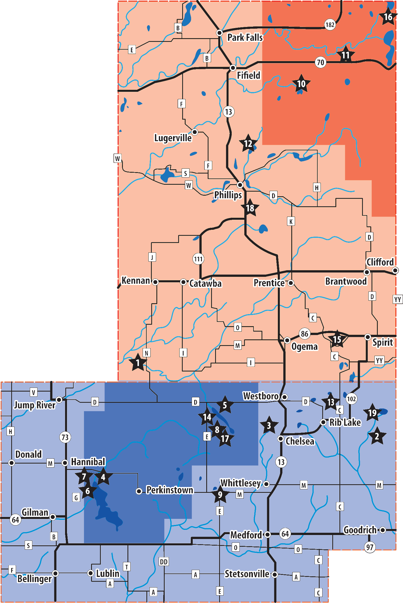 Price County was established in 1879 from parts of Lincoln and Chippewa Counties, and was named in honor of William T. Price who served in the United States Congress. Railroad expansion was instrumental in the development of Price County as goods and services were easily transported. Early industry was led by lumbering as logging camps grew to become villages and later cities. Phillips was selected as the county seat and the area continued to thrive. As logging began to slow, residents turned towards agriculture who raised livestock and grew crops. By 1910 the population of Price County had reached 13,795 and the area has since become a haven for recreational enthusiasts. Today Price County is home to approximately 20,689 residents.